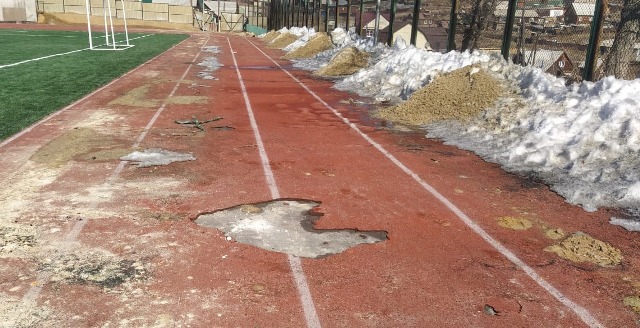 Так, на ФОК в городской общеобразовательной школе №13 в микрорайоне Аршан эксперты Народного фронта выявили отсутствие ливневой канализации и отвода сточных вод. В результате, сейчас начинает таять снег, и вода застаивается прямо на футбольном поле и на беговой дорожке. Песчаные откосы, которые сделаны для поддержания фундамента сооружения, уже подмываются и начинают распадаться, что в дальнейшем может привести к обрушению подпорок.