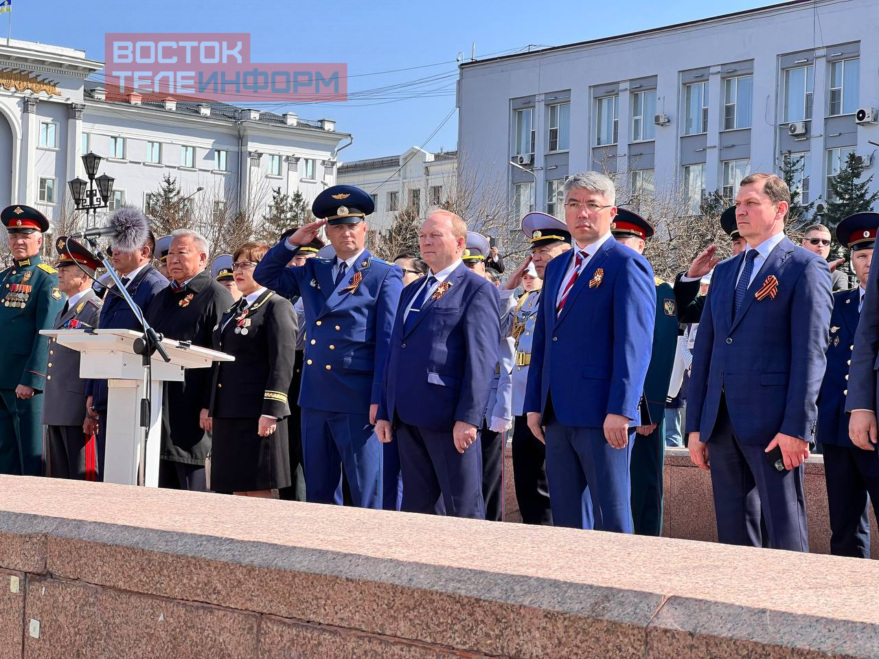 Торжественным маршем по главной площади столицы Бурятии от Восточного военного округа прошло более тысячи военнослужащих, в частности, парадные расчеты от штаба общевойскового объединения округа, соединения связи, отдельного танкового соединения, артиллерийского и ракетного соединений, зенитной ракетной воинской части, подразделений РХБ защиты и материально-технического обеспечения округа.