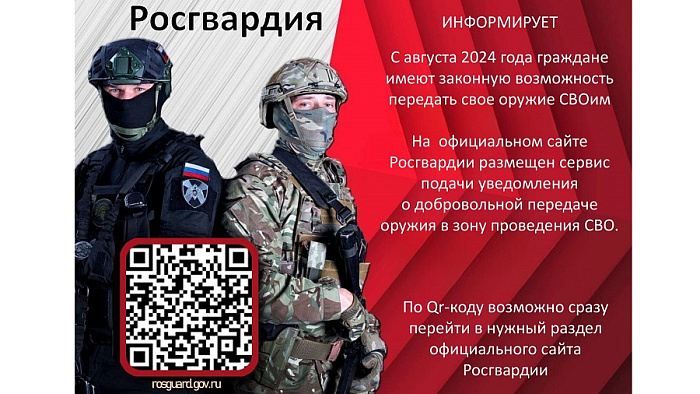 Для оформления передачи оружия владельцу необходимо подать заявление. Это можно сделать через специальный онлайн-сервис «Передача оружия в зону проведения СВО» на официальном сайте Росгвардии (https://rosguard.gov.ru/page/index/peredacha-oruzhiya-v-zonu-provedeniya-svo) либо обратиться в территориальное подразделение лицензионно-разрешительной работы по месту регистрации. Сотрудники лицензионно-разрешительной работы Управления Росгвардии по Республике Бурятия помогут подготовить документы и организуют передачу оружия и патронов.