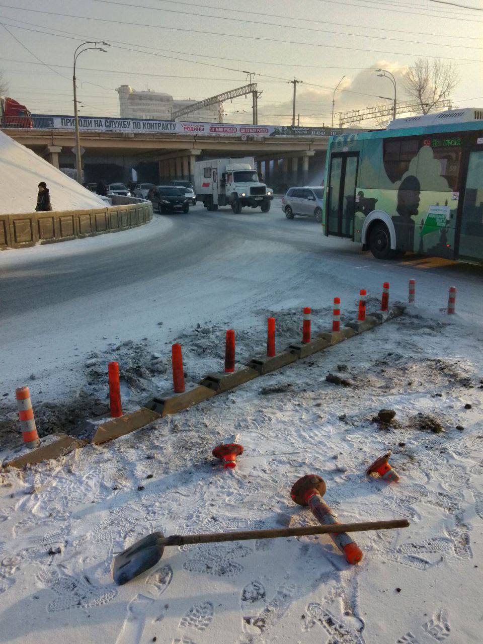В понедельник на участке дороги возле путепроводов ул. Ербанова - ул. Борсоева водители двух автомобилей совершили ДТП, в результате которого один из автомобилей выехал на «островок безопасности» и повредил элементы дорожной инфраструктуры. На следующий день сотрудники ремонтно-строительной бригады комбината по благоустройству восстановили 9 поврежденных делиниаторов.