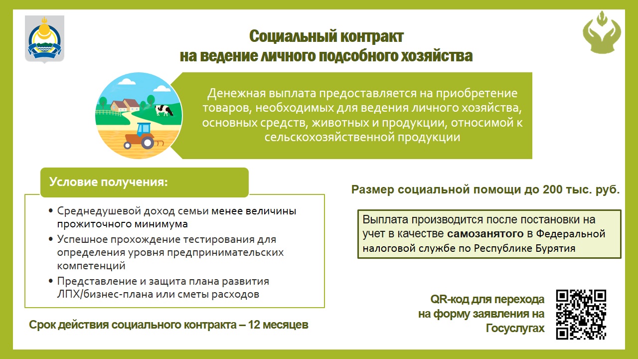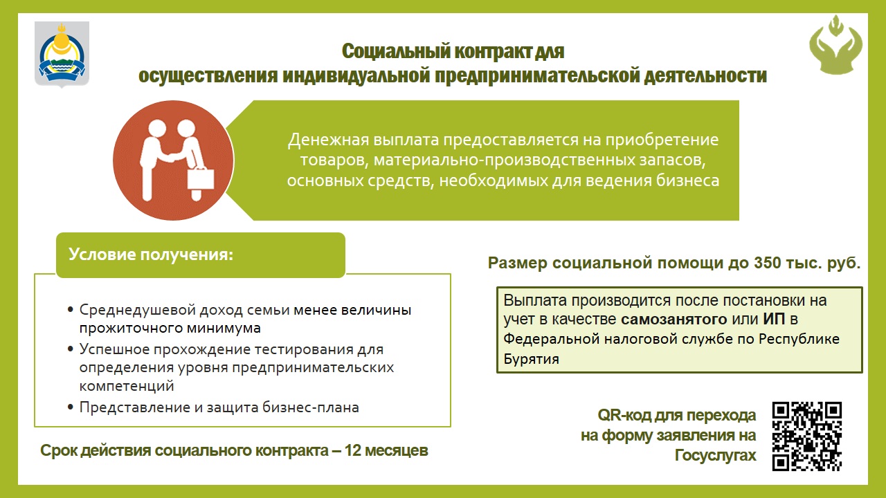 Для получения финансовой помощи необходимо обратиться в филиал фонда «Защитники Отечества» в Республике Бурятия. Специалисты фонда окажут помощь в подаче заявления, проведут оценку компетенций, объяснят порядок оформления документов и при соответствии требованиям предоставят рекомендацию на заключение социального контракта. Кроме того, ветераны могут бесплатно пройти обучение основам предпринимательства.