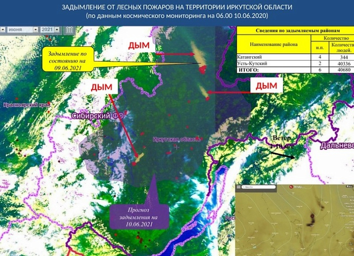 В Иркутской области дым от лесных пожаров накрывает населенные пункты. По данным космического мониторинга, накануне, 9 июня, в зону задымления от лесных пожаров попали 6 населённых пунктов Катангского и Усть-Кутского районов: Ерема, Калинина, Мога, Преображенка, Турука, Усть-Кут.