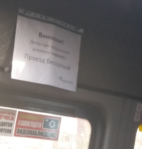 В Улан-Удэ появилась бесплатная маршрутка для школьников-отличников. Водитель маршрута №2 разместил у себя в салоне объявление: «Внимание! Детям при предъявлении дневника с оценкой 5 – проезд бесплатный». Фотографию автобуса разметили в группе «Аноним 03», пишет Восток-Телеинформ.