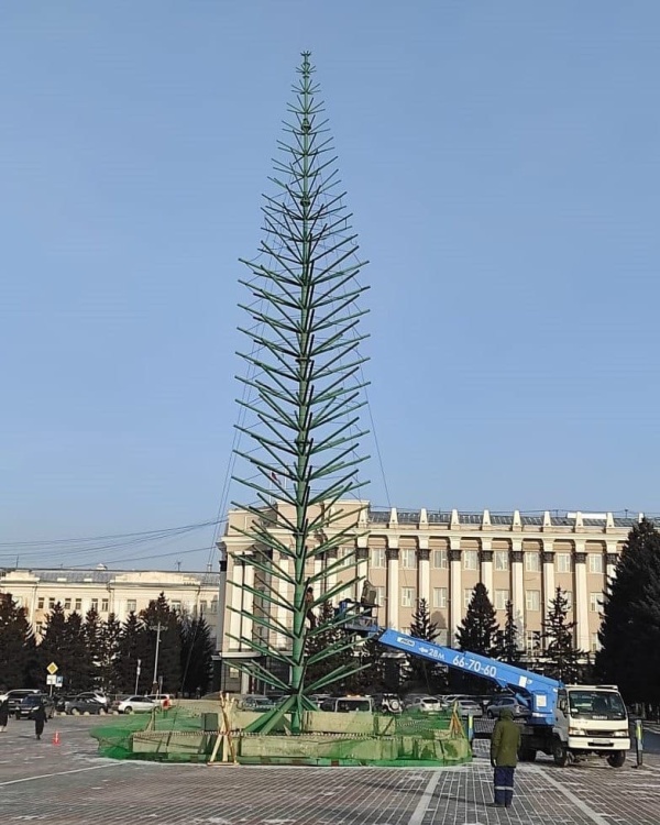 Елка высотой 25,5 метров украшает главную площадь Улан-Удэ уже третий год. Главную новогоднюю красавицу украсят около 1000 шаров, которые привезут со складов «Горсвета».