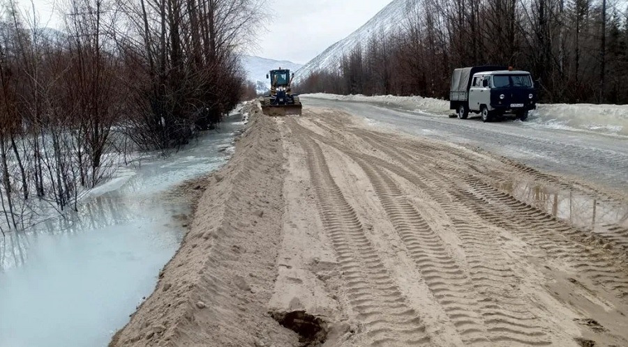 Дорожные службы не допустили выхода наледных вод на проезжую часть автомобильной дороги. Там устроили поперечную прорезь для пропуска наледи, устроили лафет для проезда транспорта, отсыпали вал вдоль дороги, чтобы не пустить воду на проезжую часть, саму дорогу выровняли щебнем.