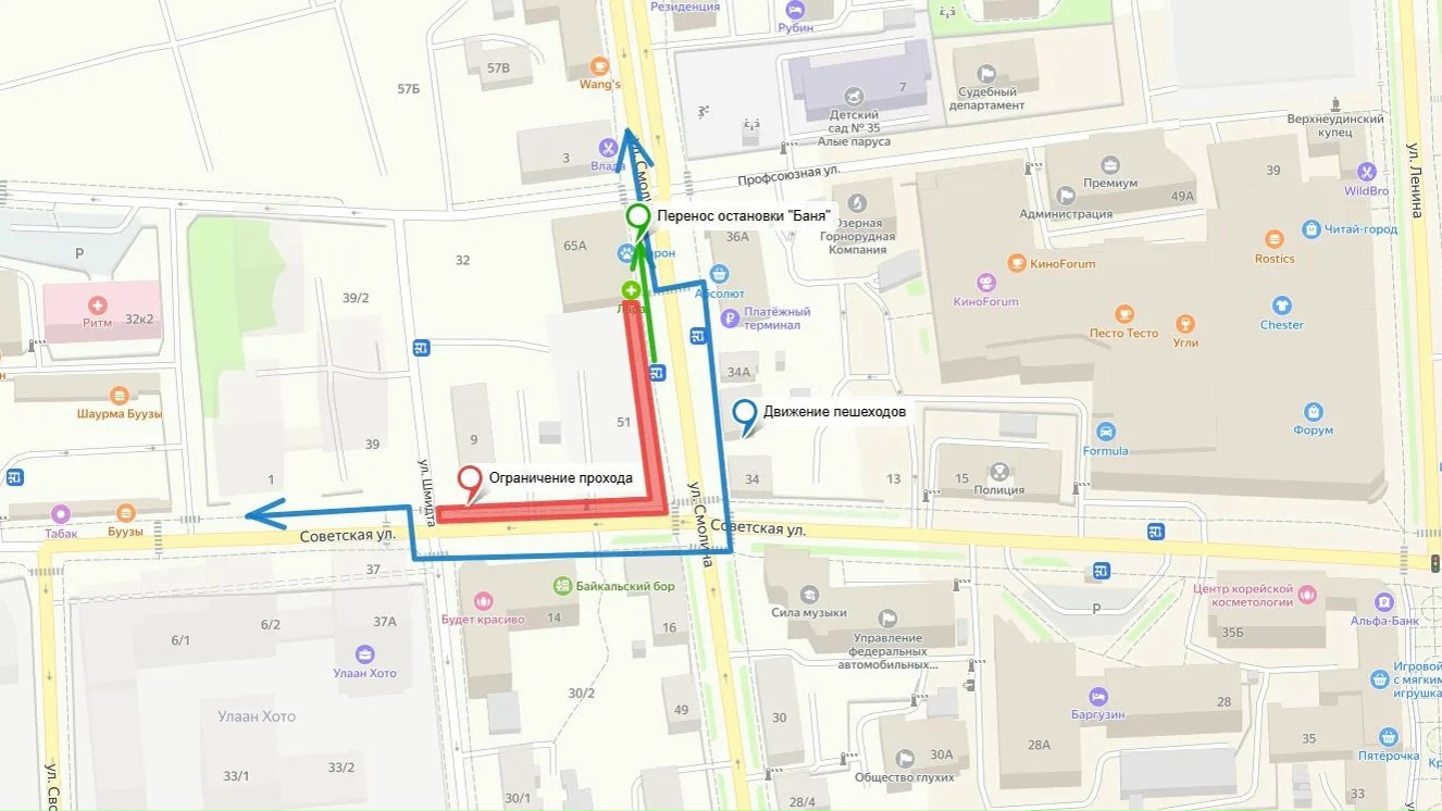 В Улан-Удэ в связи с проведением строительных работ по возведению многоквартирных домов для обеспечения безопасности граждан и удобства проезда общественного транспорта с 18 апреля остановка «Баня №1» будет временно перенесена в сторону «БГУ» на 40 метров.