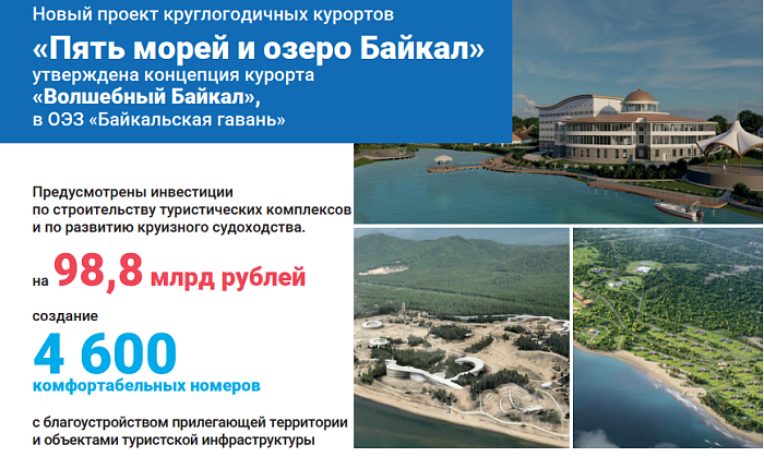 Также в текущем году утверждена концепция курорта «Волшебный Байкал», который расположится в особой экономической зоне «Байкальская гавань». Предусмотрены инвестиции по строительству туристических комплексов и развитию круизного судоходства почти на 98,8 миллиардов рублей внебюджетных инвестиций, что позволит создать 4,6 тысяч комфортабельных номеров с благоустройством прилегающей территории и объектами туристской инфраструктуры.