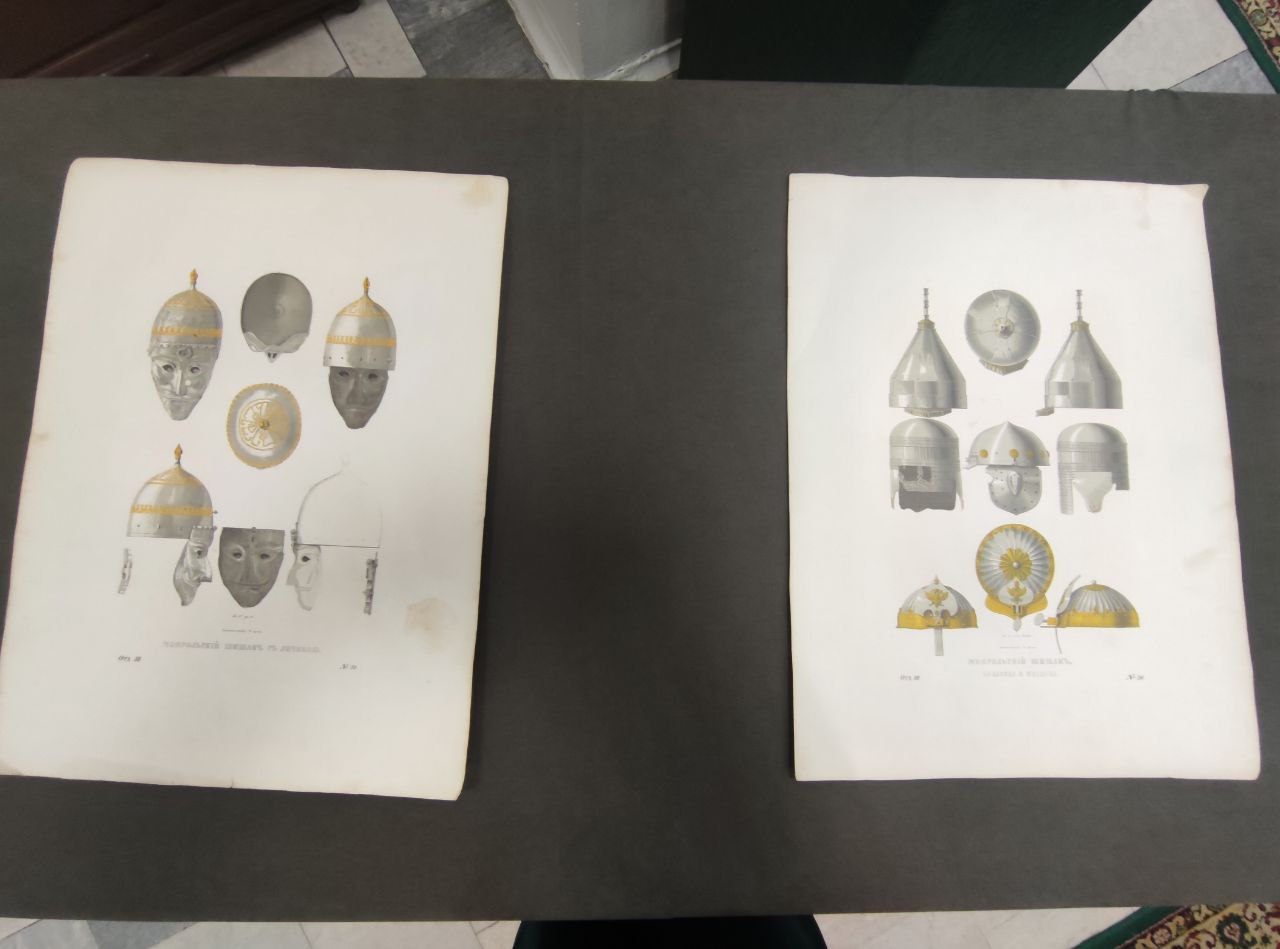Два листа из многотомного издания 1853 года «Древности Российского государства» раздела «Броня, оружие, кареты и конская сбруя» передали бурятские таможенники в музейный фонд.