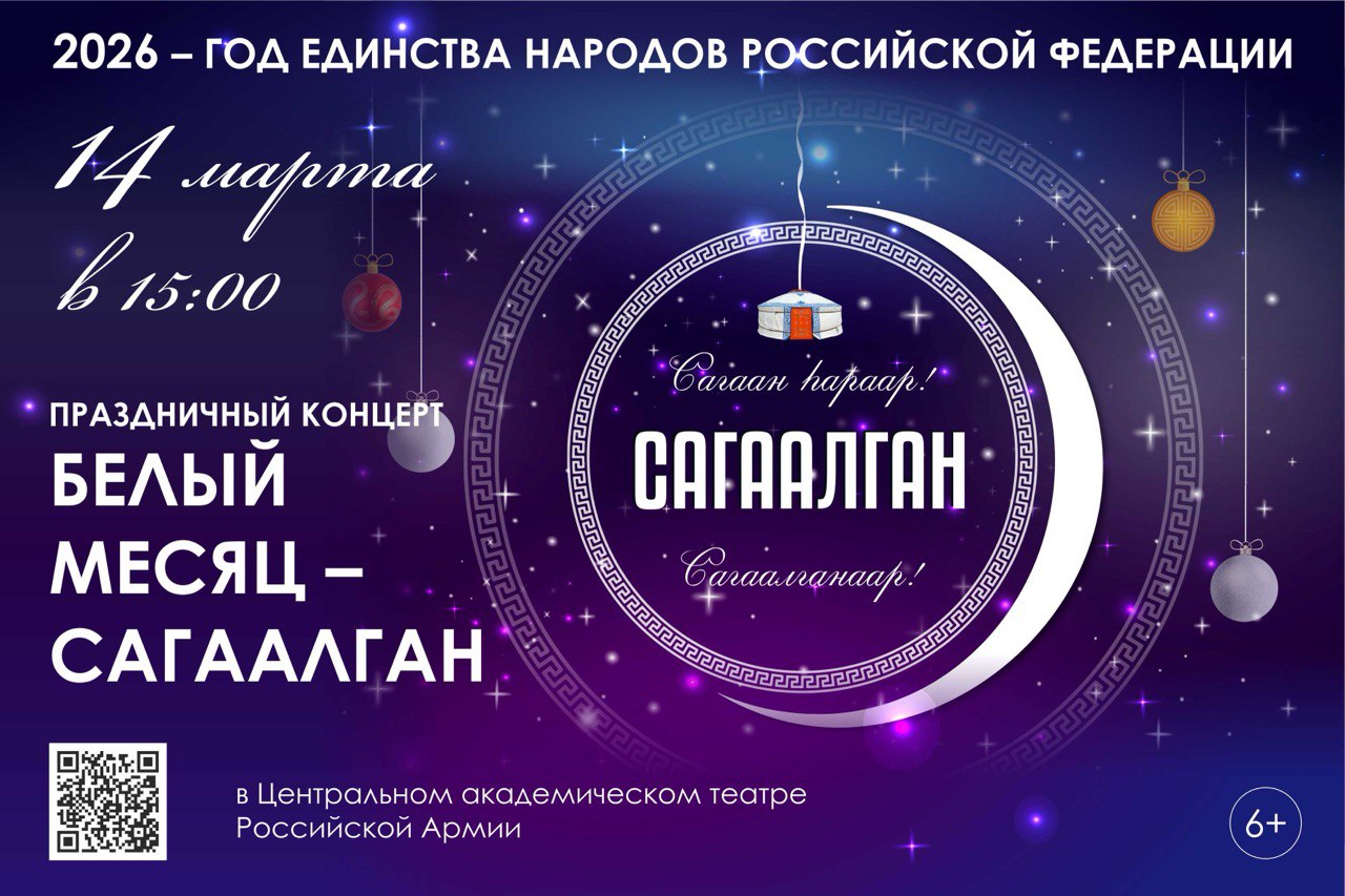 Праздничный концерт, посвященный празднику Белого месяца — Сагаалгану, состоится 14 марта в 15 часов в Москве. Он пройдет в Центральном академическом театре Российской Армии. На сцене выступят известные исполнители из Бурятии, Монголии и Тывы.