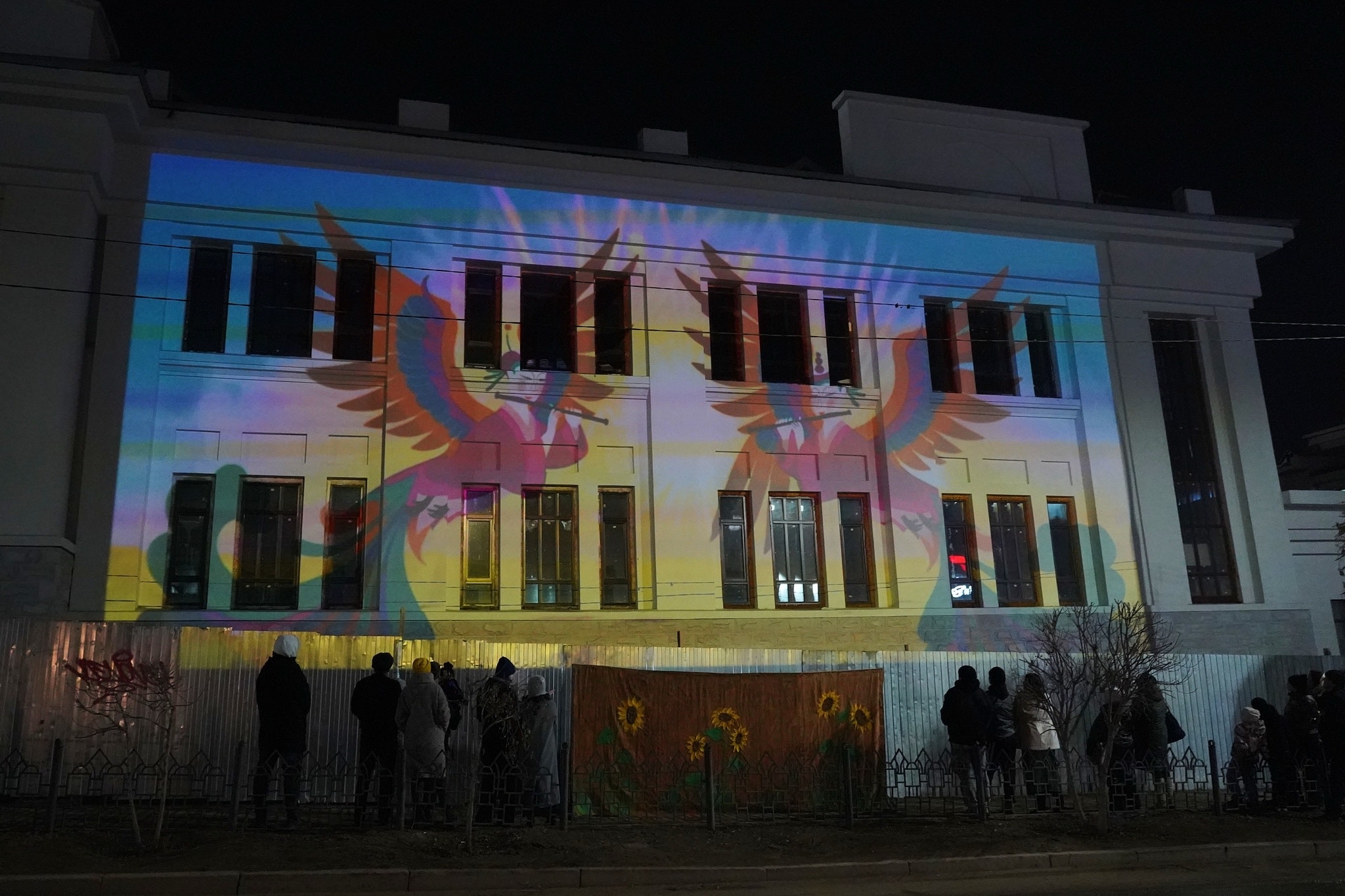 Театр кукол «Ульгэр» представил масштабное световое шоу-проекцию «Театру скоро 60». Мероприятие собрало сотни зрителей, которые разместились на тротуаре у ТРЦ напротив.