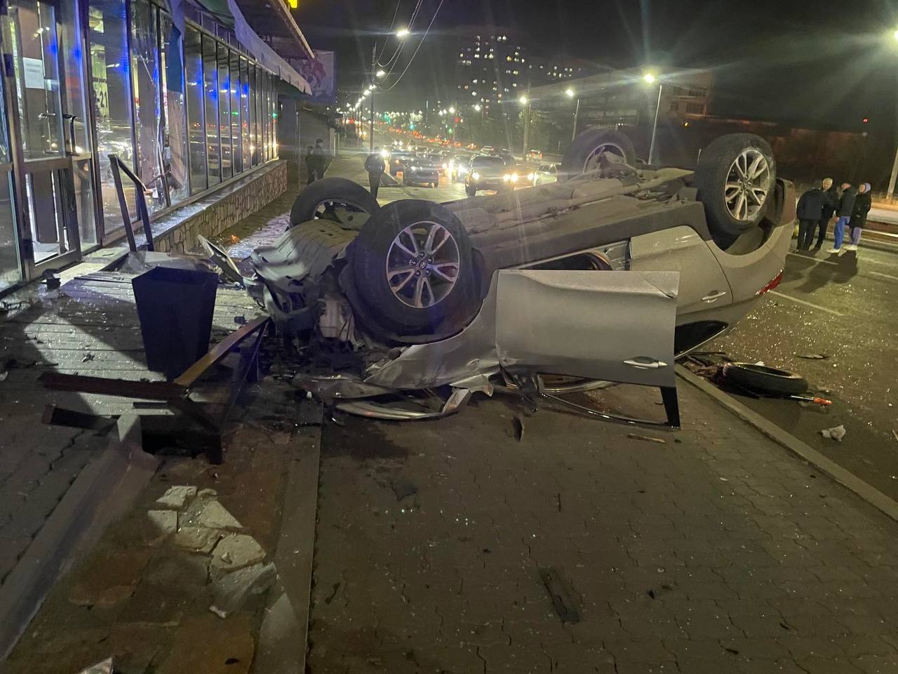 В результате ДТП водитель автомобиля «Hyundai Tucson» допустил наезд на бордюр с последующим опрокидыванием и повреждением крыльца торгового павильона.
