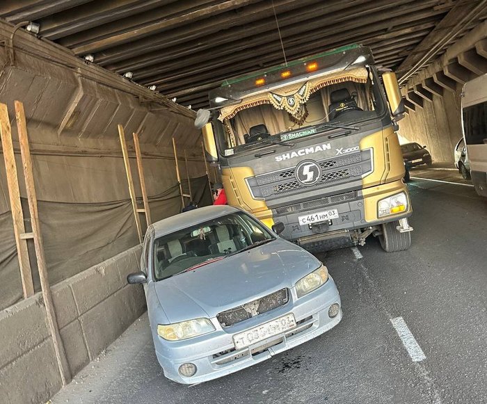 ДТП под путепроводом произошло в Улан-Удэ сегодня, 16 октября. Водитель большегруза Shacman не увидел автомобиль «Ниссан», врезался и протащил его еще 15 метров, сообщает Аварком Батыр Артыков.