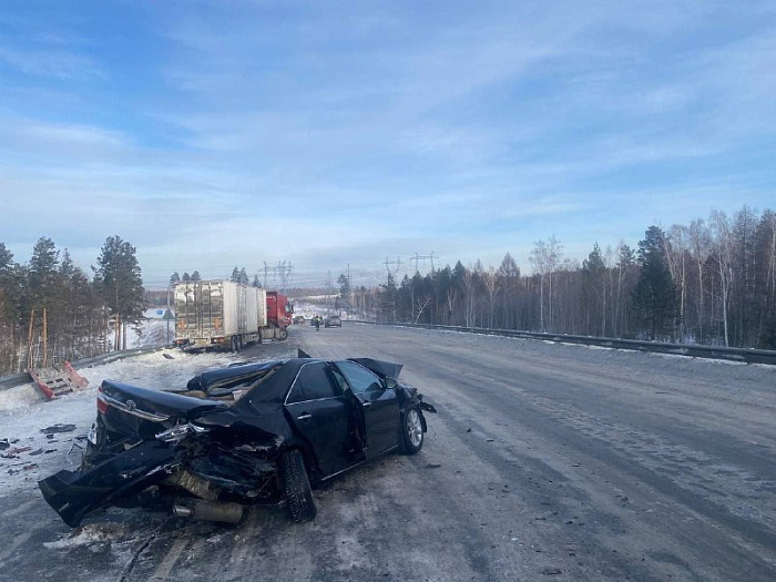 ДТП с тремя пострадавшим произошло на 29 километре федеральной автомобильной дороги Р-258 «Байкал» сегодня в 13 часов 30 минут. 45-летний водитель фуры двигался в Иркутск, но не справился с управлением, выехал на полосу встречного движения и столкнулся с легковым автомобилем «Тойота Камри».