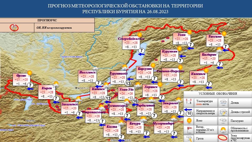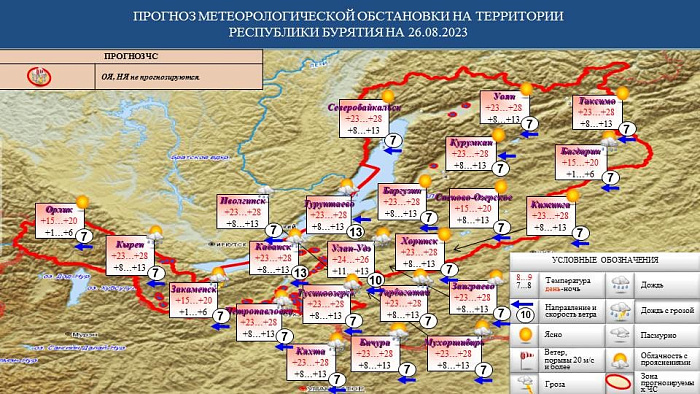 В Улан-Удэ: преимущественно без осадков. Утром местами туман. Ветер восточный 5-10 м/с. Температура ночью +11,+13, днем +24,+26, пишет Восток-Телеинформ со ссылкой на ГУ МЧС России по Бурятии.