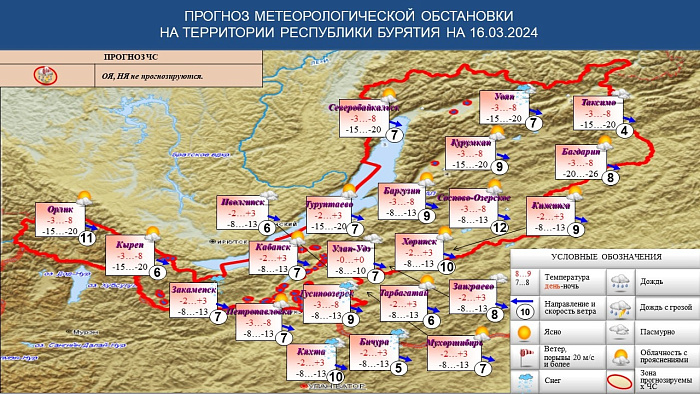 В Улан-Удэ, по данным синоптиков, 16 марта преимущественно без осадков. Ветер северо-западный 7-12 м/с. Температура ночью -8,-10, днем около 0.
