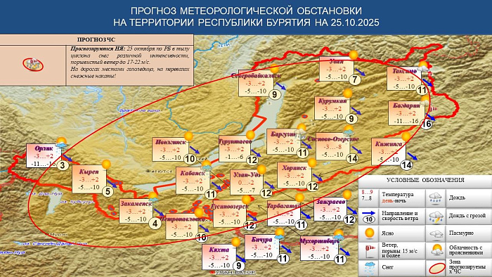 По данным Бурятского ЦГМС - филиала ФГБУ «Забайкальское УГМС» прогнозируются неблагоприятные метеоявления, 25 октября по РБ в тылу циклона снег различной интенсивности, порывистый ветер до 17-22 м/с. На дорогах местами гололедица, на перевалах снежные накаты.