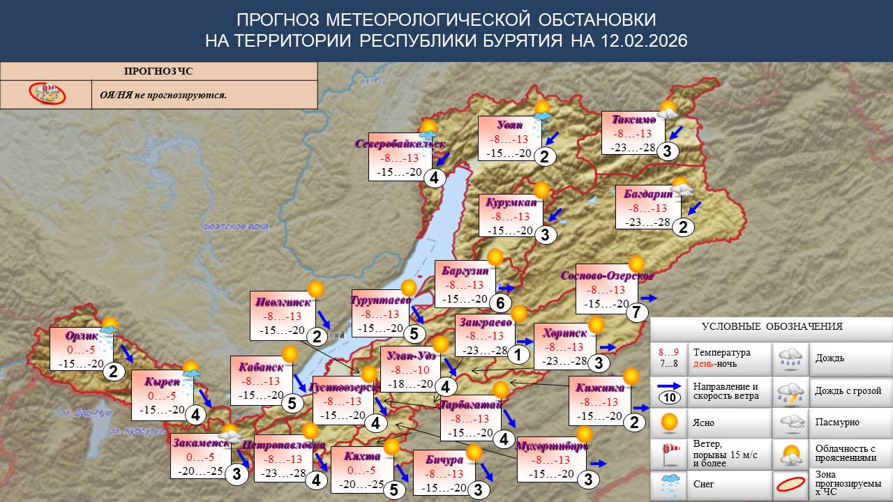 В Бурятии 12 февраля, по данным Бурятского ЦГМС - филиала ФГБУ «Забайкальское УГМС», неблагоприятные метеоявления не прогнозируются.