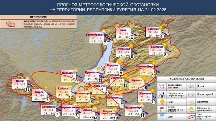 В Бурятии, по данным синоптиков, 20 февраля переменная облачность, местами небольшой снег, ночью по юго-западу до умеренного. Ветер северо-западный 7-12, отдельных районах 15-18 м/с, поземок, заносы. Температура ночью -15…-20°, местами -25…-30°, днем -9…-14°, местами -18…-23°.