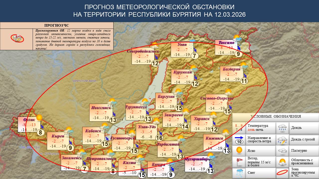В Бурятии, по данным Бурятского ЦГМС - филиала ФГБУ «Забайкальское УГМС», прогнозируются опасные метеоявления: 12 марта осадки в виде снега различной интенсивности, усиление северо-западного ветра до 15-22 м/с, местами метели, снежные заносы, понижение дневной температуры воздуха на 10 и более градусов. На дорогах города и республики гололедица, накаты.