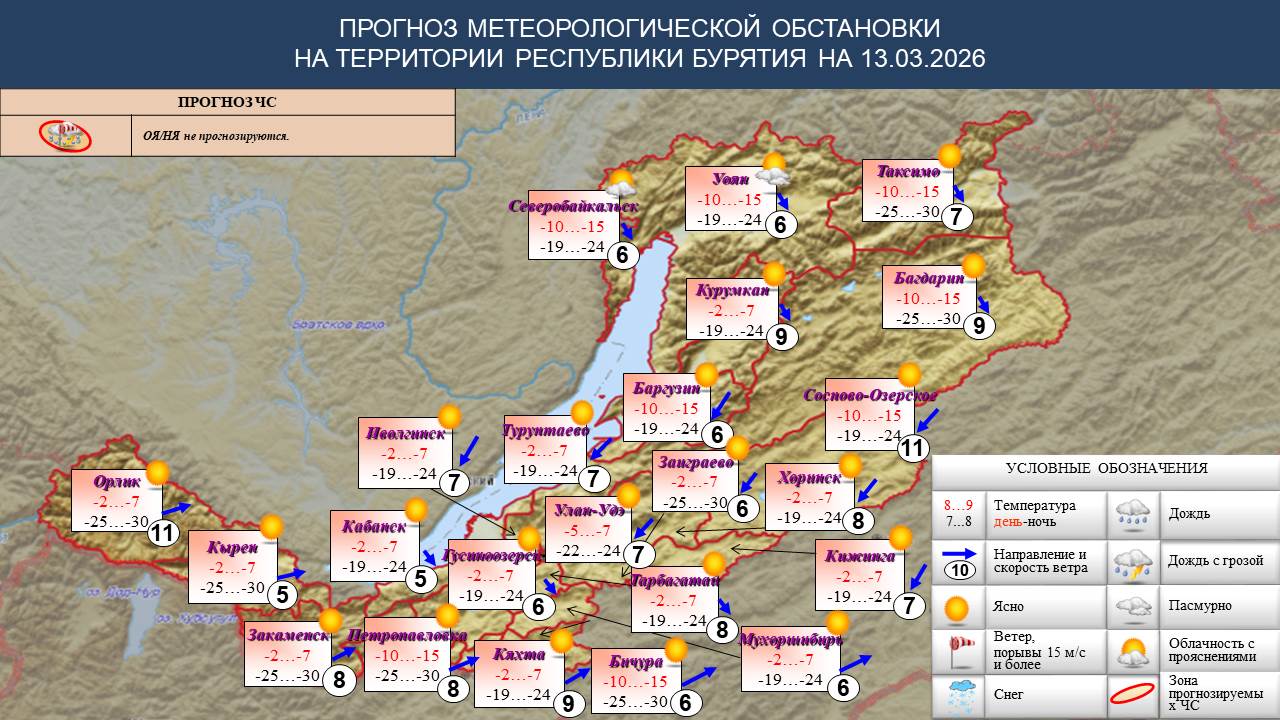 В Бурятии, по данным синоптиков, 13 марта холодная преимущественно без осадков погода. Ветер переменный 5-10, местами до 14 м/с. Температура воздуха ночью -19…-24°, местами -25…-30°, днем -2…-7°, местами по северу -10…-15°.