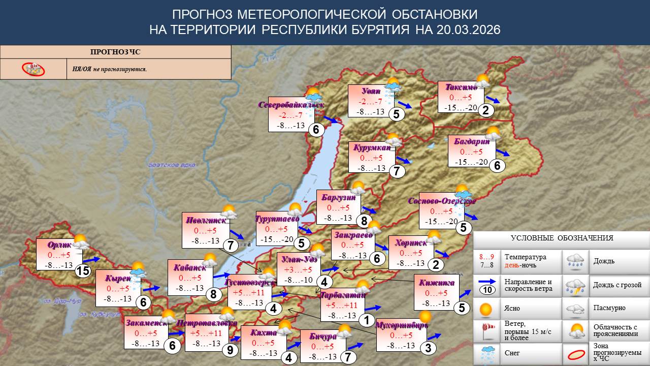 Температура ночью -15…-20, местами -8…-13, по северным районам -21…-26, днем 0,+5, местами до +11, по Прибайкалью и северу -2,-7.