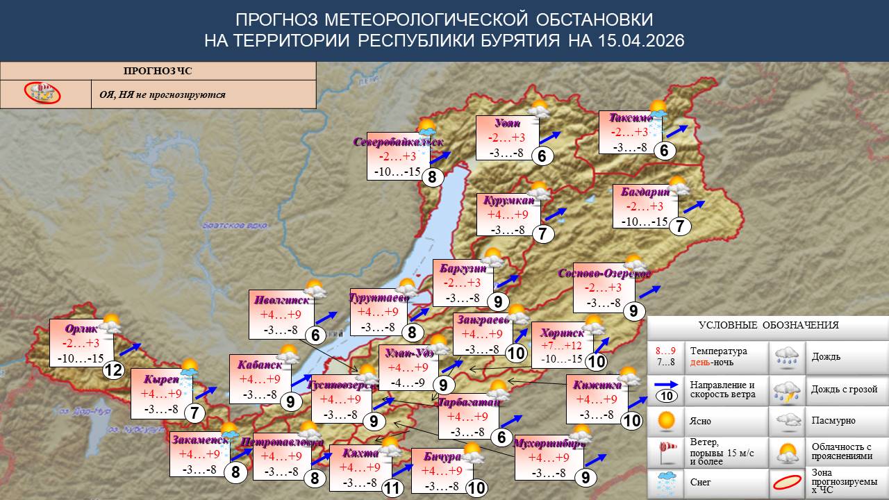 В Улан-Удэ без осадков. Ветер северо-западный 5-10 м/с. Температура ночью -4-6°, днем +4+6°.