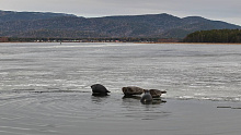Нерпы решили полежать по льду прямо у посёлка на Байкале