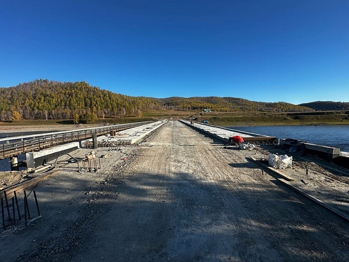 На данный момент полностью завершены работы по армированию и бетонированию моста и береговых конусов. Сегодня ведутся работы по устройству деформационных швов, укреплению конусов сопряжения моста с насыпью. В ближайшие дни планируется начать работы по укладке асфальтобетонного покрытия.