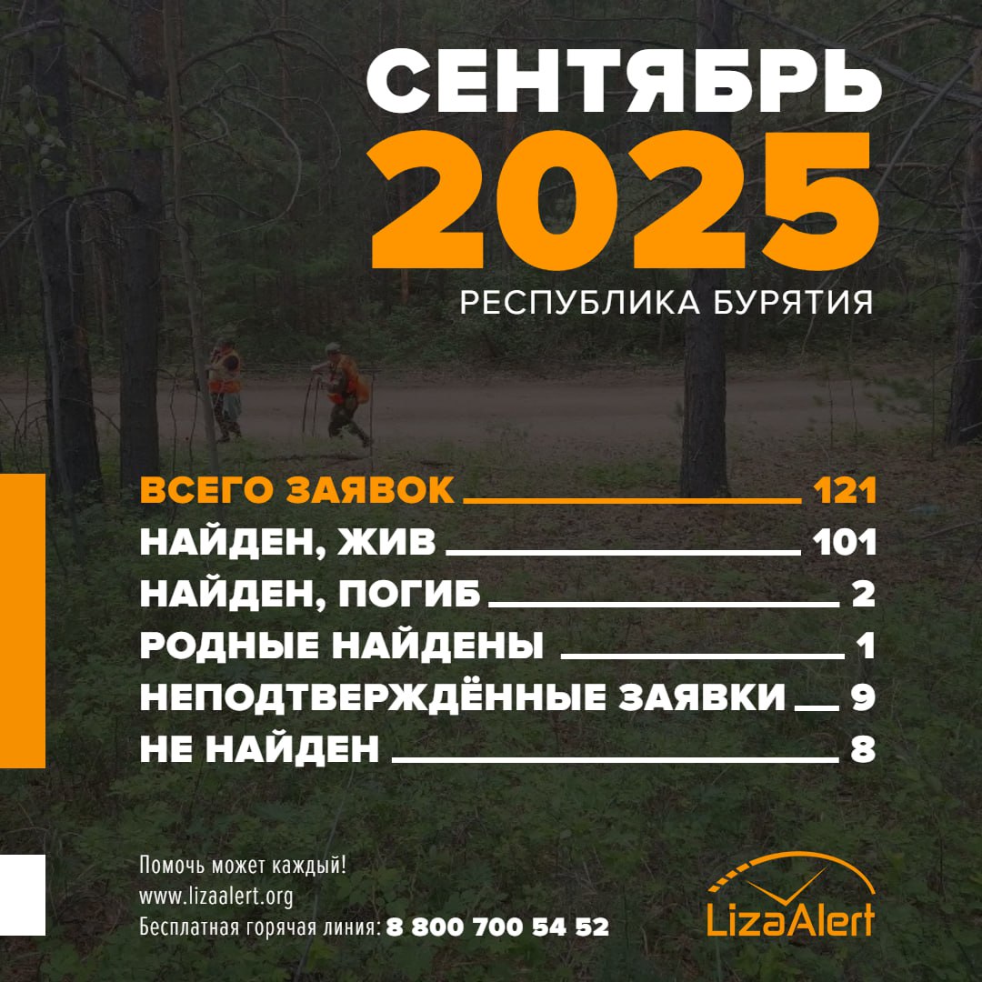 Сентябрь 2025 года стал месяцем активной работы отряда "ЛизаАлерт в Республике Бурятия". Всего поступила 121 заявка на поиск людей, из них 101 человек найден живым, двое погибшими, у одного найдены родные. До сих пор продолжаются поиски восьми человек, не подтвердились 9 заявок.