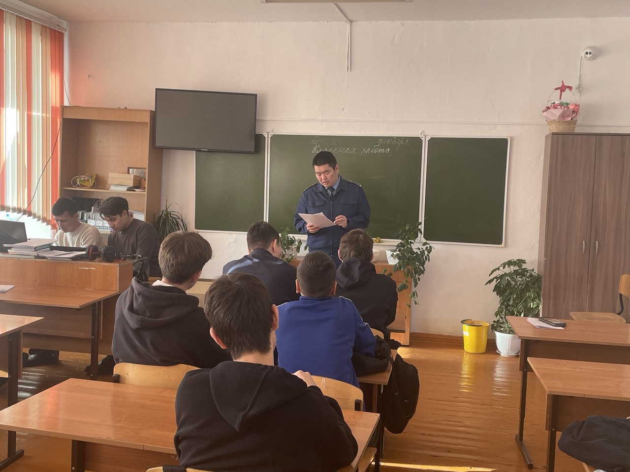 Прокуратура Джидинского района провела просветительское мероприятие для учеников 9 класса МБОУ «Петропавловская СОШ №1». Помощник прокурора района Васильев Ринчин в доступной для детей форме рассказал об основах пожарной, дорожной безопасности, правилах поведения на водных объектах и в быту.