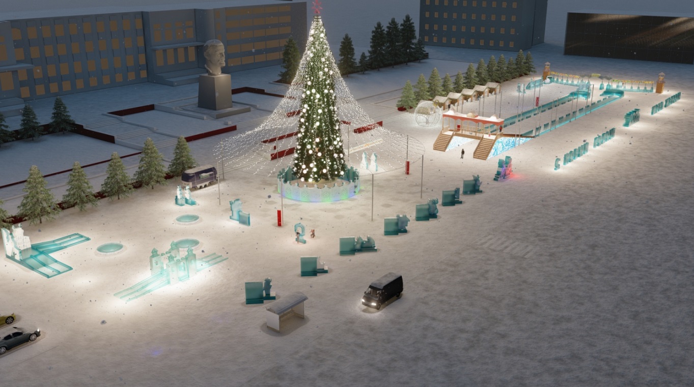 В ледовом городке будут большая и малая «катушка», детская игрушка «Терем», «Град» и «Чаша». В стоимость входит подсветка – в том числе, елочная гирлянда и шатер над Большой катушкой, подсветка льда и скульптур. Кроме того, проект предусматривает размещение обогревателей для рук, которые уже полюбились горожанам в прошлые зимы.