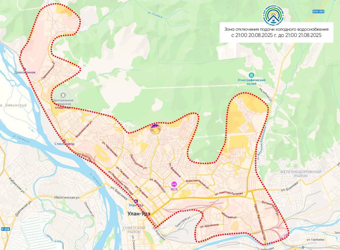 Карта отключения холодной воды в Улан-Удэ 20 августа. На сутки отключат холодную воду в части города Улан-Удэ 20 августа. Ограничение введут в 21 час, сообщает мэрия города.