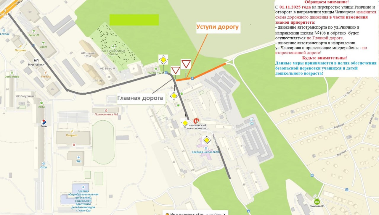 Так, движение по Ринчино в направлении школы №108 и обратно будет осуществляться по "Главной", а движение в направлении ул. Ченкирова и прилегающие микрорайоны – по «Второстепенной дороге».
