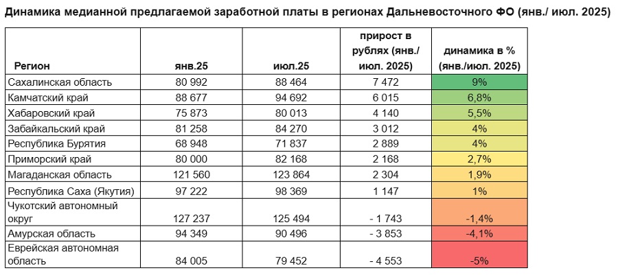 Кроме того, выше среднего по ДФО находятся зарплатные предложения в Камчатском крае (94 692 руб.), Амурской области (90 496 руб.), Сахалинской области (88 464 руб.) и Забайкальском крае (84 270 руб.). В остальных регионах предлагаемые зарплаты ниже медианы по ДФО: в Приморском крае (82 168 руб.), Хабаровском крае (80 013 руб.), Еврейской автономной области (79 452 руб.), а наименьшая средняя зарплата зафиксирована в Бурятии (71 837 руб.).