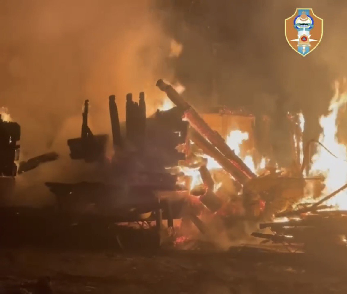 Оперативными действиями угроза жилому дому была снята. В результате пожара уничтожены надворные постройки, баня, кровля зимовья, а также повреждена кровля гаража. Общая площадь составила пожара 190 кв.м. Пострадавших нет. Предварительной причиной пожара является короткое замыкание в бане, сообщает Республиканское агентство ГО и ЧС.