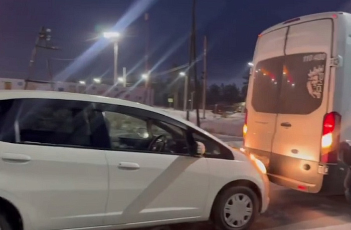 Автобус притормозил перед светофором, а в этот момент водитель на машине «Honda Fit» въехал ему в задний бампер. Это произошло из-за несоблюдения безопасной дистанции в условиях гололеда.