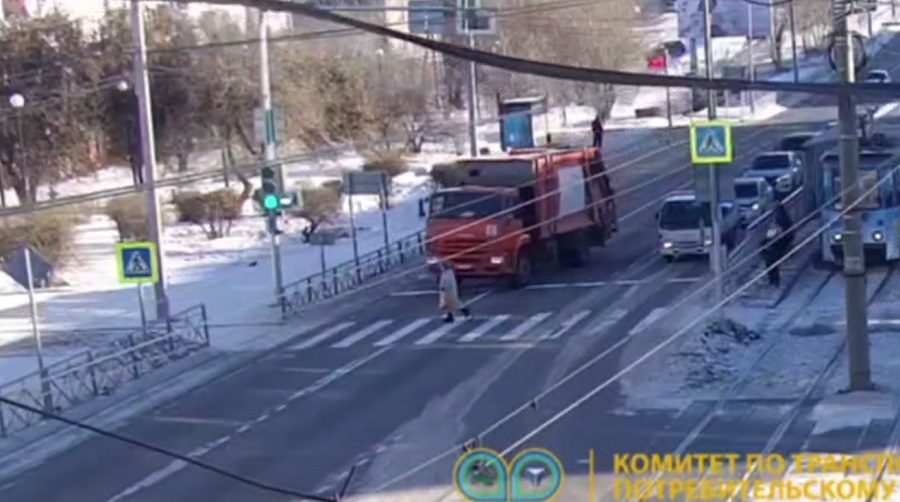 Судя п видео, женщина переходила дорогу за запрещающий сигнал светофора. Мусоровоз двигался на зеленый, водитель попытался уйти от столкновения, но и женщина ускорилась и попала под машину.