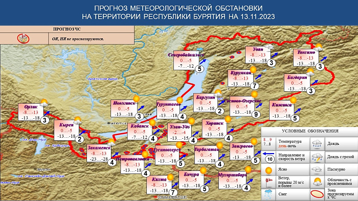 Ветер юго-западный 2-7, в отдельных районах до 12 м/с. Температура ночью -13,-18, местами -23,-28, по югу и Прибайкалью при облачности -7,-12, днем 0,-5, местами -8,-13.